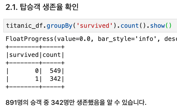 select survived, count(1) from titanic group by survived 쿼리가 위와 같다면.. 앞에 select에 있는 survived가 중요한게 아니라 group by에 있는 survived가 중요하다. SQL문의 select에서 survived를 선택한 건 뒤에 group by 에서 survived가 사용되기 때문이다.