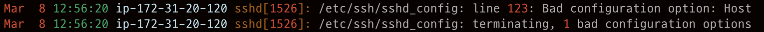 sshd_config의 123번째 라인에 잘못 추가한 에러 내용이 담겨 있었다..
