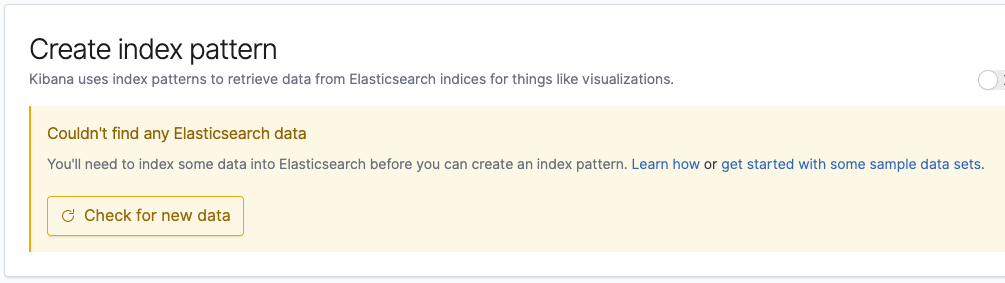 현재는 Elasticsearch에 데이터가 아무것도 없기 때문에 Index Pattern을 설정하고 싶어도 아래와 같이 데이터가 없다는 알림만 나온다.