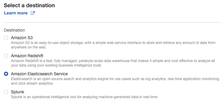 Destination에서 Elasticsearch를 선택한다.