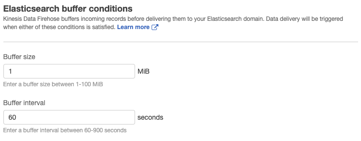 Elasticsearch buffer conditions은 1MiB와 60seconds로 설정했다.