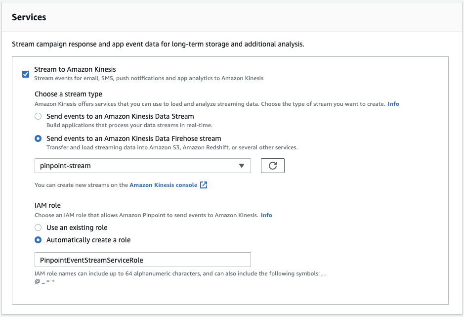 Amazon Pinpoint → 원하는 프로젝트 클릭 → Settings → Event stream → Edit → Stream to Amazon Kinesis에 체크