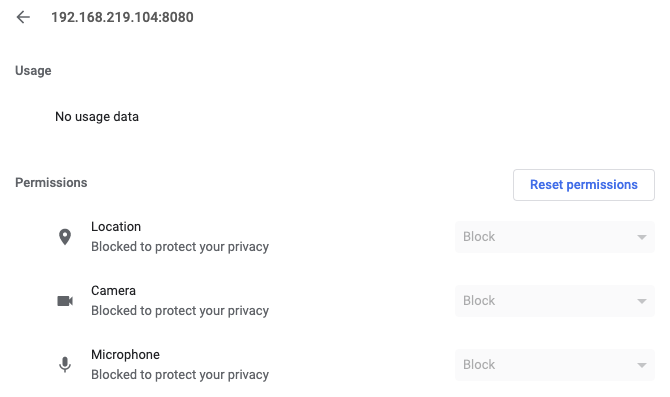 http 서버에 접속하니, 좌측 상단에 'Not Secure' 라고 뜨는 것이 보여 그걸 클릭해 봤더니 아래처럼 Camera, Microphone을 강제로 Block 시켜놓은 것이 보인다.
