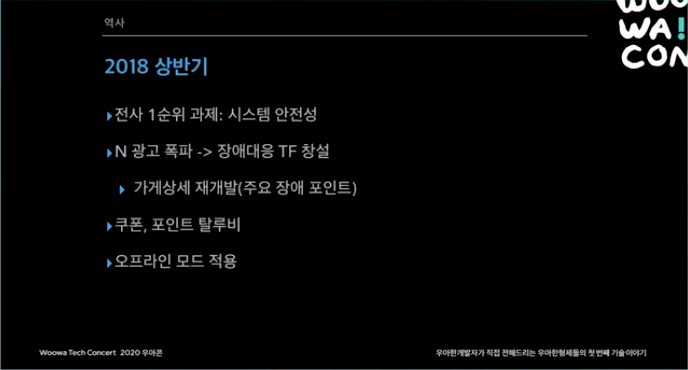 2015년. 처음에는 모놀리틱 서비스 였다. 리뷰 시스템쪽에 장애가 나더라도 시스템 전체가 먹통되는 일이 생기곤 했다. 하루 주문수 10만건이 넘어가면서 마이크로서비스 도전을 시작했다.